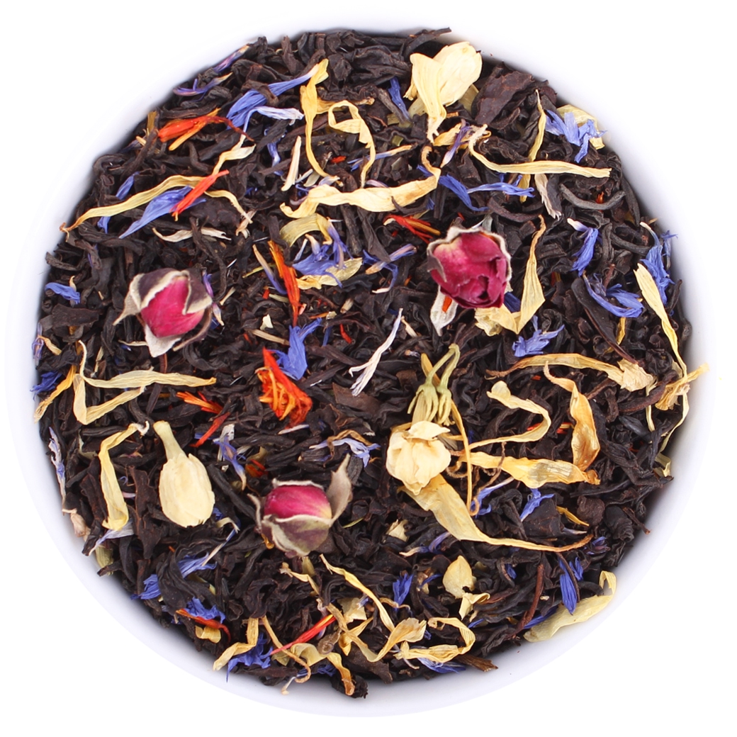 Состав: чёрный индийский чай, чёрный цейлонский чай, бутоны розы, бутоны жасмина, лепестки василька, ноготки, сафлор.