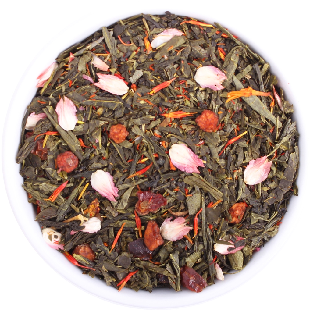 Состав: зелёный китайский чай Сенча, кожура шиповника, ягоды рябины, лепестки сафлора, лепестки гомфрены розовой.