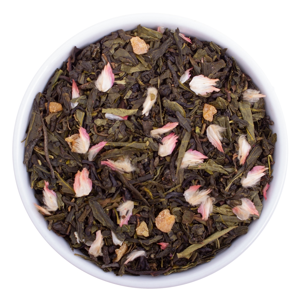 Состав: зелёный китайский чай (Сенча, Зелёная улитка, Чун Ми), белый чай, кусочки персика, лепестки гомфрены розовой, брови Бога долголетия.