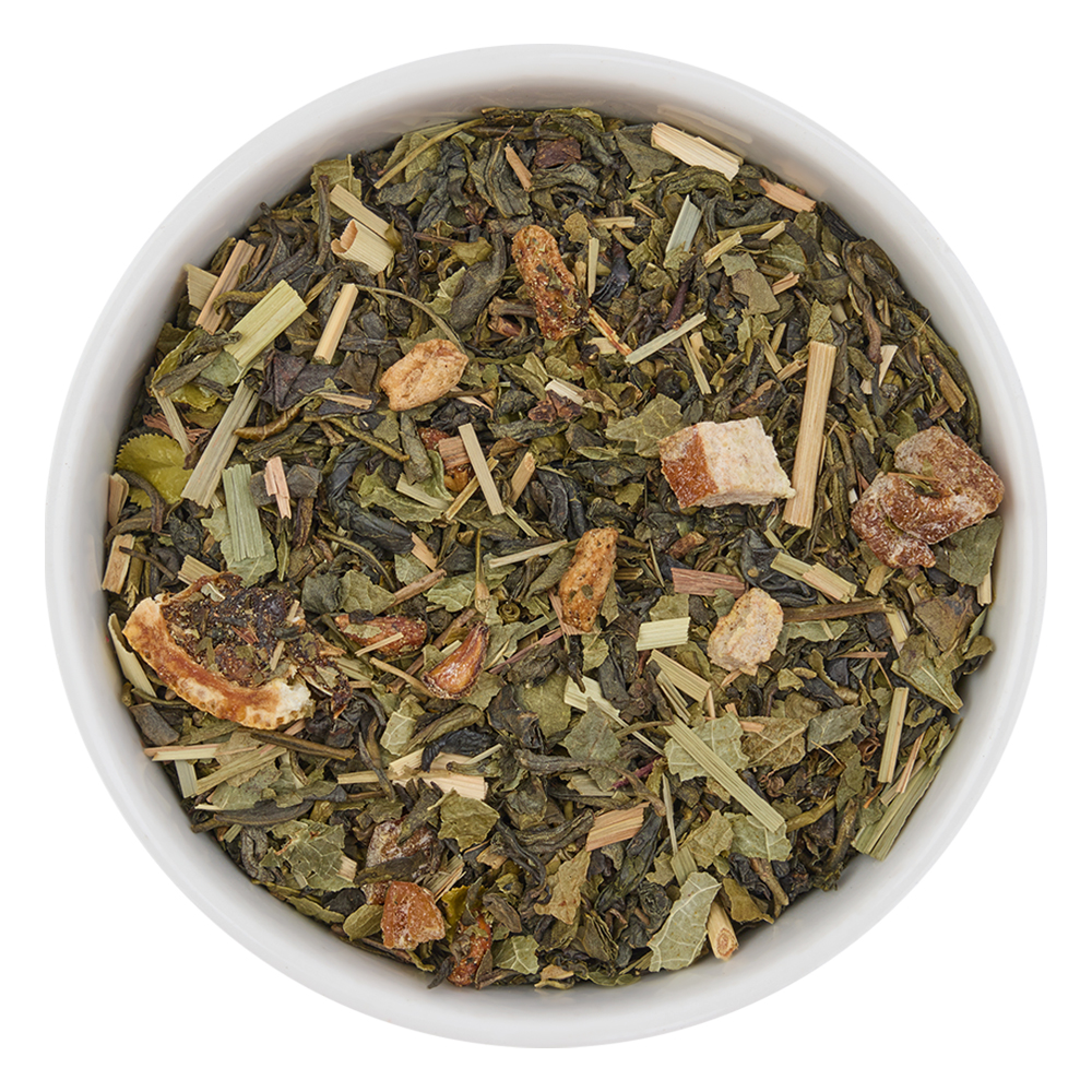 Состав: зеленый китайский чай (Сенча, Снежная обезьяна), кумкват зеленый, мята, чабрец.