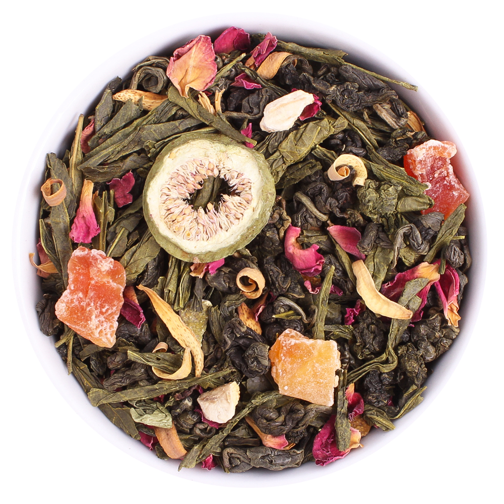 Состав: зеленый китайский чай (сенча, зеленая улитка), улун, папайя, инжир, цедра апельсина, цветок апельсина, лепестки роз