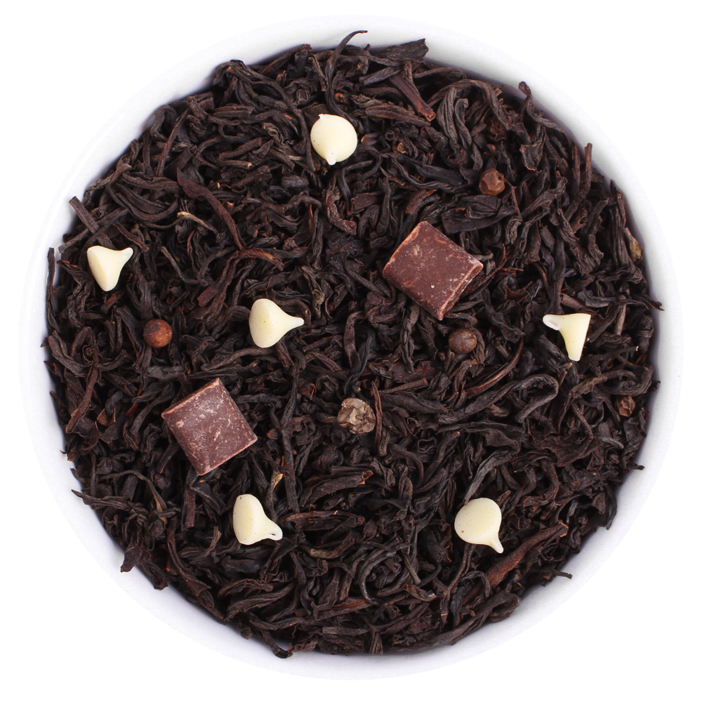 Состав: черный индийский чай, черный цейлонский чай, кубики шоколадные, капли белого шоколада, перец черный горошек