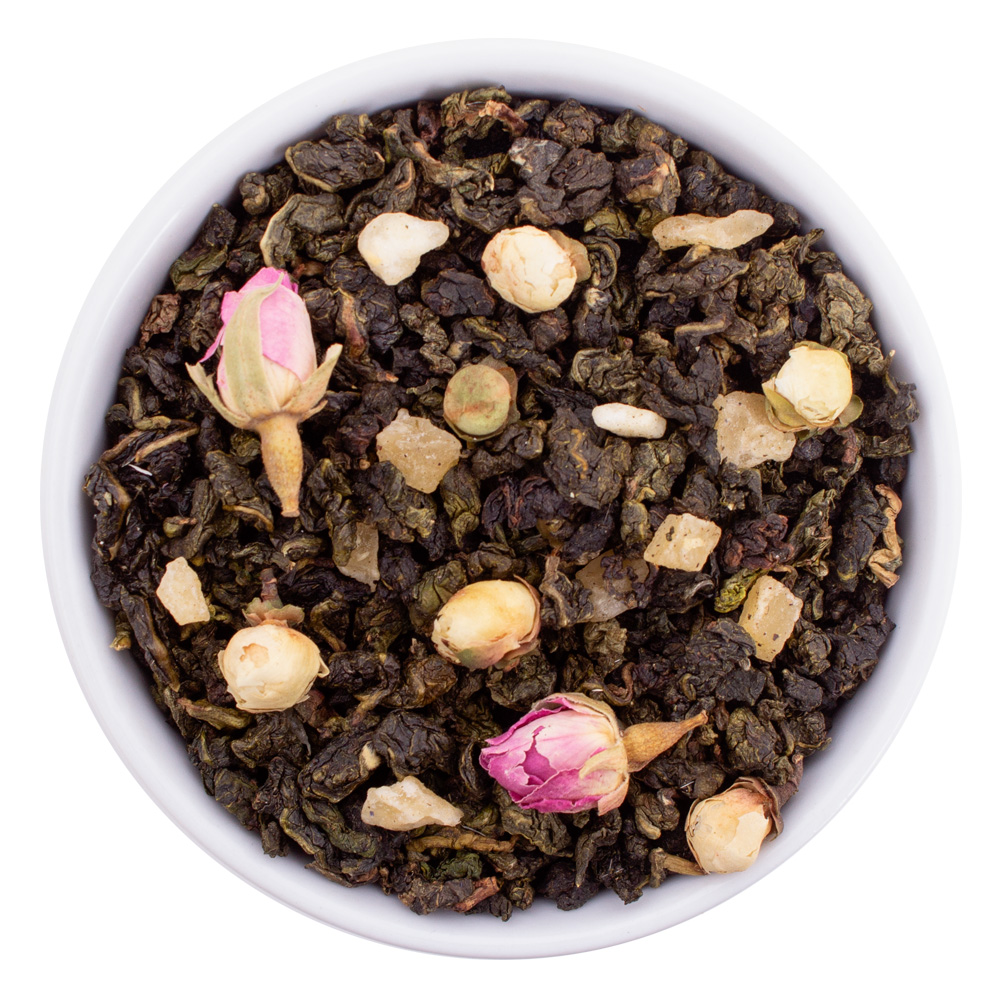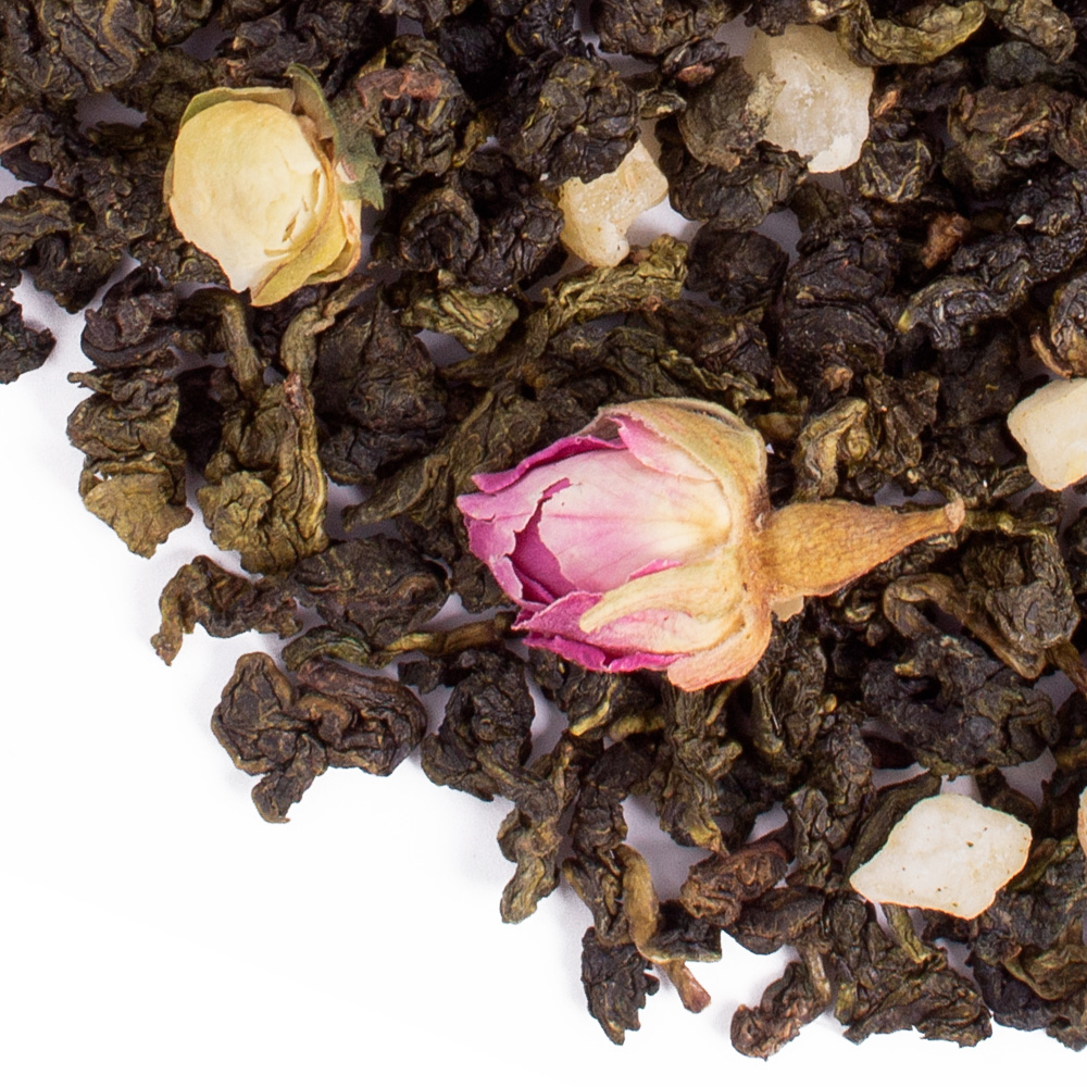 Состав: слабоферментированный чай улун, кусочки ананаса, бутоны камелии, бутоны роз розовые