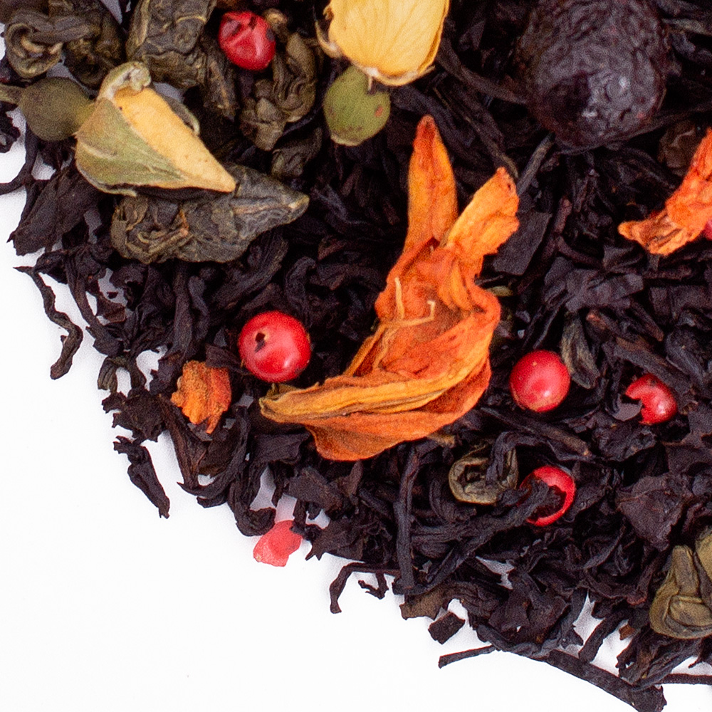 Состав: черный индийский чай, черный цейлонский чай, иван-чай, цветки гибискуса, черный перец, лепестки гомфрены