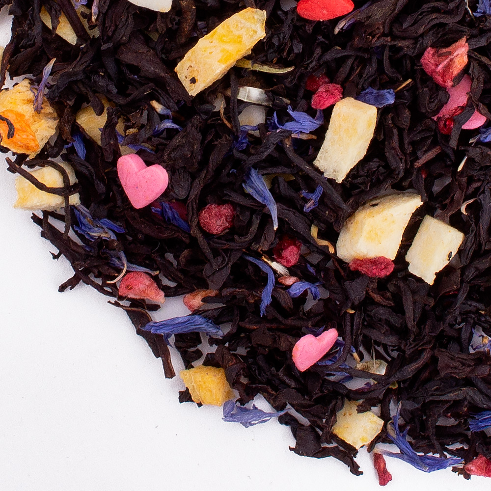 Состав: черный индийский чай, черный цейлонский чай, кусочки тыквы, кусочки малины, сахарные сердца, василек, лепестки гомфрены