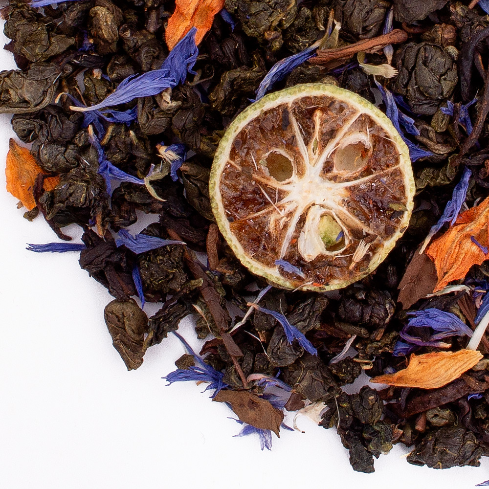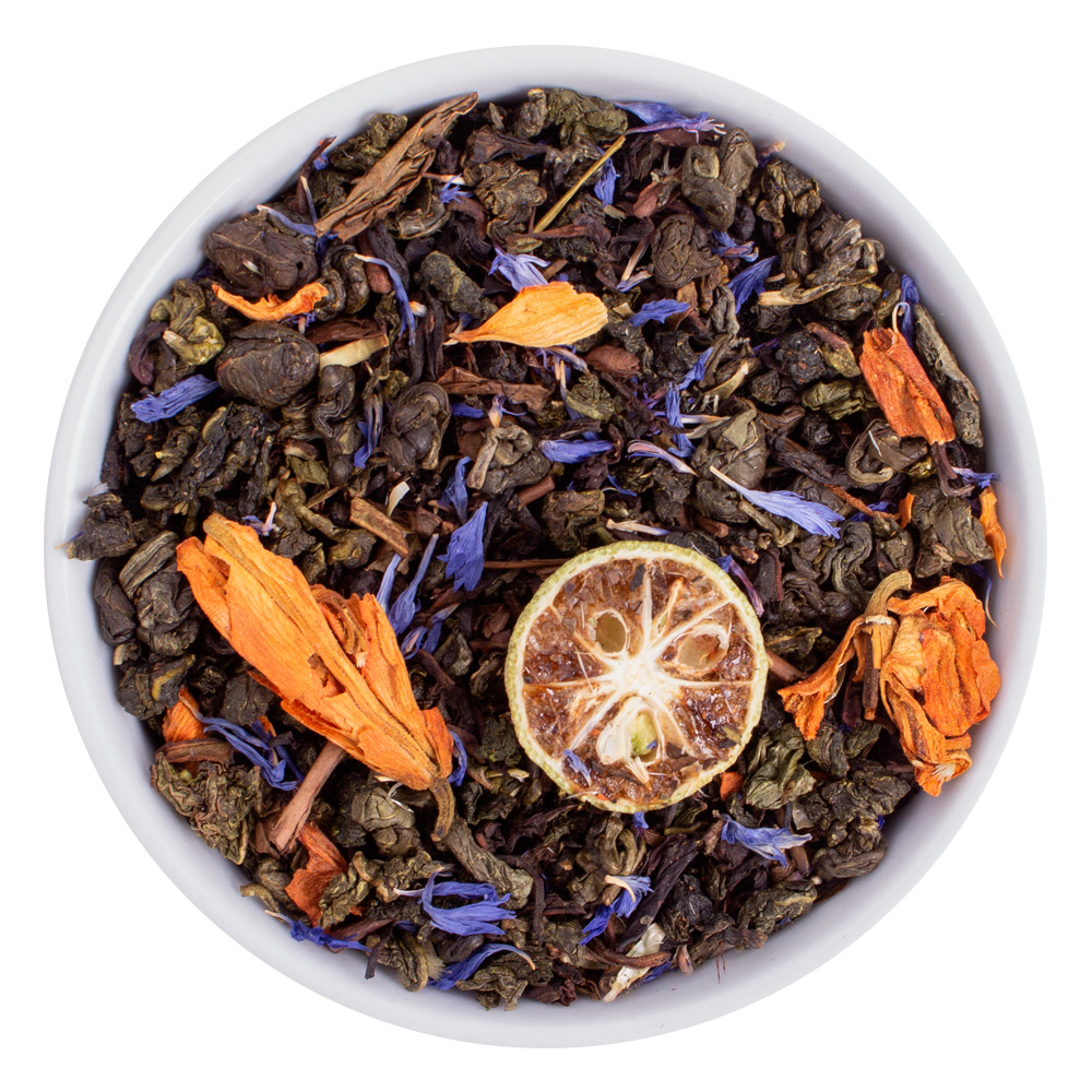 Состав: слабоферментированный чай улун, китайский зеленый чай (“Зеленая улитка”), черный индийский чай Дарджилинг, японский чай Ходжича, кумкват зеленый, цветы лилии, василек